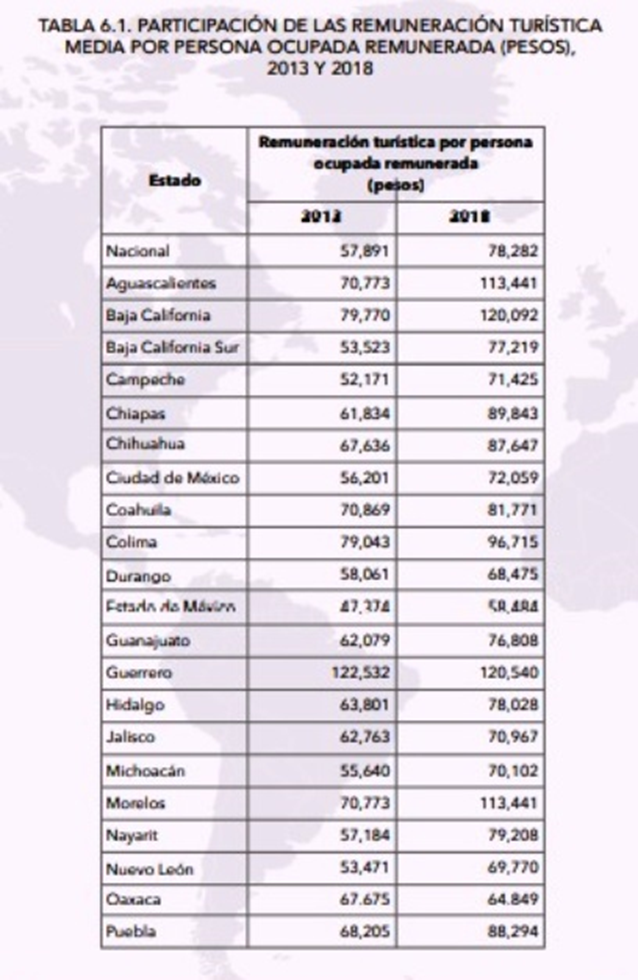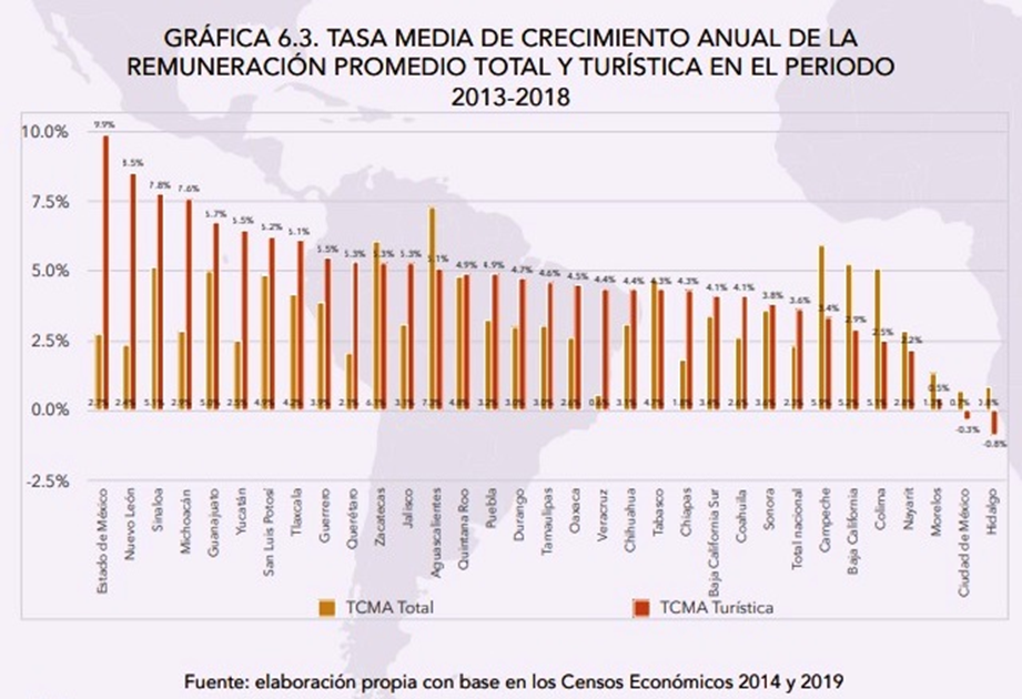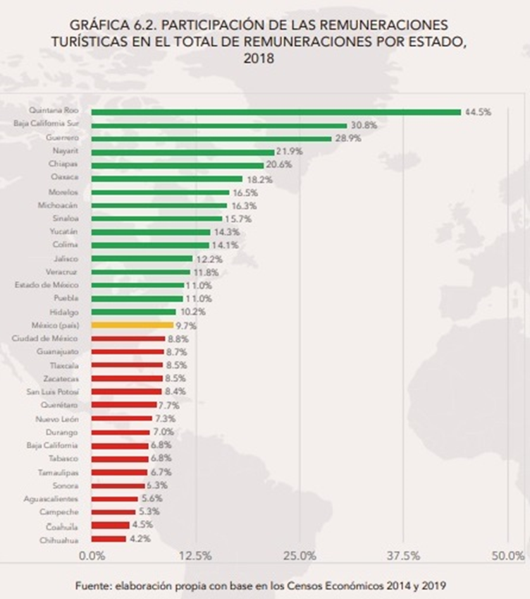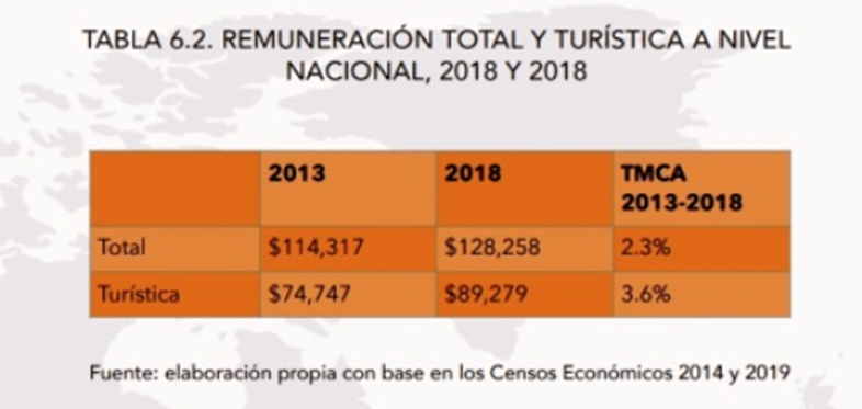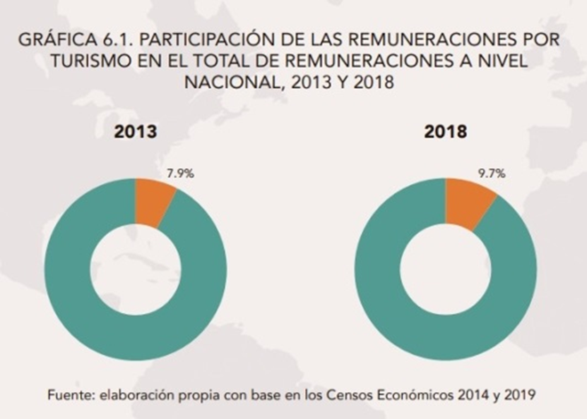 De acuerdo con los Censos Económicos de Inegi de 2019, el total de remuneraciones pagadas en el país asciende a 2,084.8 miles de millones de pesos en el país. La participación de las remuneraciones turísticas en el total del país creció 1.8 puntos porcentuales con respecto a la participación que tenía en 2013. Las remuneraciones por turismo son particularmente importantes en Quintana Roo, donde el 44.5% del total de las remuneraciones del estado provienen del turismo. Además, Quintana Roo es sólo uno de los 16 estados donde la participación de las remuneraciones turísticas está por arriba de la media nacional. El 9.7% de las remuneraciones que se pagan en el país se relacionan con la actividad turística; el monto pagado asciende a más de 200 mil millones de pesos
