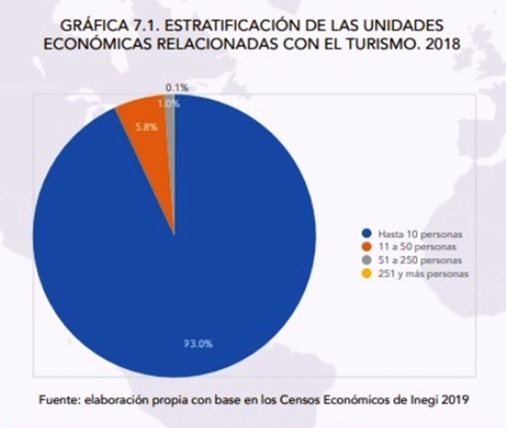 De acuerdo con la estratificación de unidades económicas por su tamaño, las microempresas son unidades económicas donde el personal ocupado total a lo largo del último año ha sido de hasta diez personas. Como se ve en el siguiente gráfico, para el año 2018 estas empresas conforman al 93.0% del total de unidades económicas dedicadas al turismo en el país, entre actividades características y conexas. El total de unidades económicas con actividades turísticas características o conexas era de 786,54011.