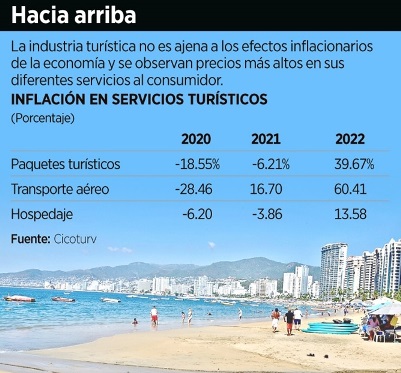 En el mismo periodo del año pasado, el Índice Nacional de Precios al Consumidor (INPC) para los servicios turísticos en paquete fue de 90 unidades y para este año llegó a 125.70, lo cual representó una diferencia de 39.67 por ciento, de acuerdo con los datos del Cicotur.