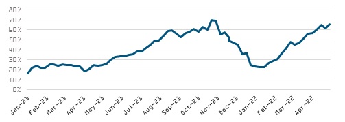 El ADR (tarifa diaria promedio) del primer trimestre fue de 90 euros, con un relevante incremento desde los 97 euros del mes de marzo hasta los 116 euros en abril, mismo nivel que en 2019. La tendencia alcista del ADR continúa en mayo, lo que implicaría aproximarnos al nivel de RevPar comparable de 2019 sostenido por la estrategia de maximización del ADR que compensa en parte la menor ocupación.