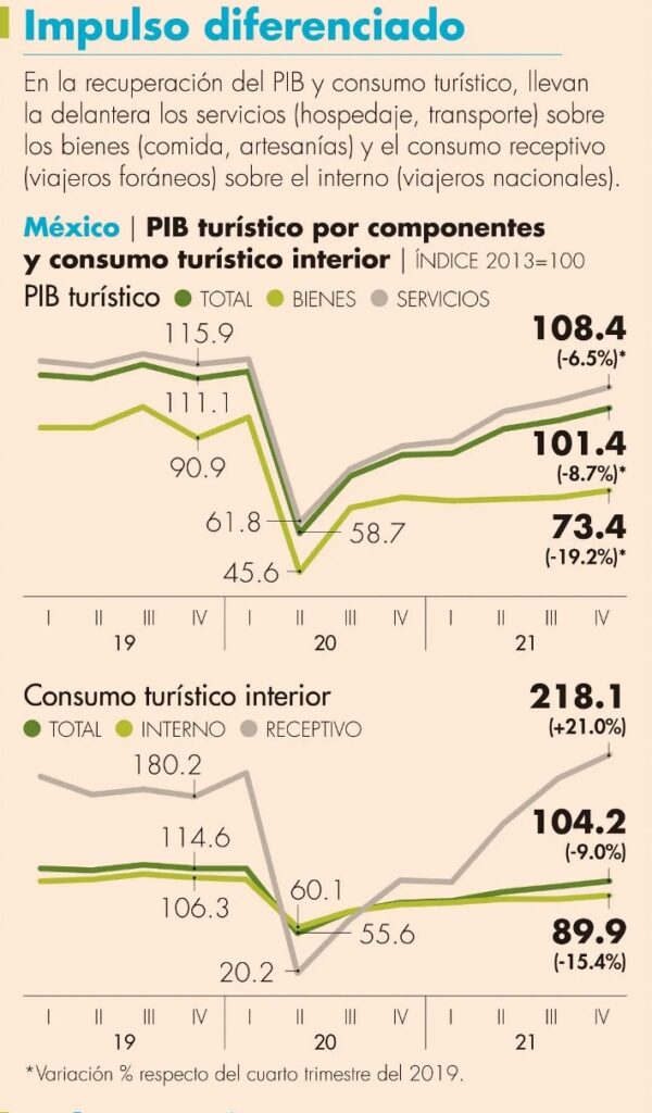 “La estimación de Cicotur es que el PIB turístico disminuyó en el 2021, en relación con el 2019, en el 16.0 por ciento. Asimismo, se estima que el turismo habría contribuido con el 7.1% del PIB nacional a precios constantes. Así, de los 3.9 puntos que se redujo el PIB nacional, con relación a los niveles de 2019, 1.3 puntos se explicarían por las afectaciones del turismo”, se detalló. Otro indicador que refleja la afectación es el empleo. Con datos del IMSS, la cifra de empleo formal en turismo durante enero del 2022 registró 114,984 trabajadores que en enero del 2020.