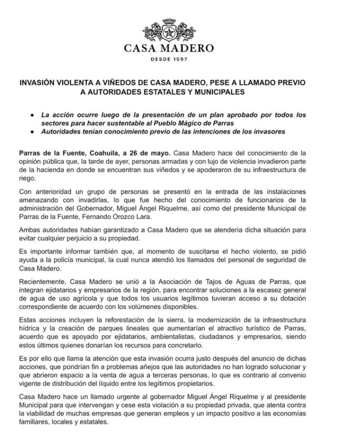 “Casa Madero hace un llamado urgente al gobernador Miguel Ángel Riquelme y al presidente Municipal para que intervengan y cese esta violación a su propiedad privada, que atenta contra la viabilidad de muchas empresas que generan empleos y un impacto positivo a las economías familiares, locales y estatales”.