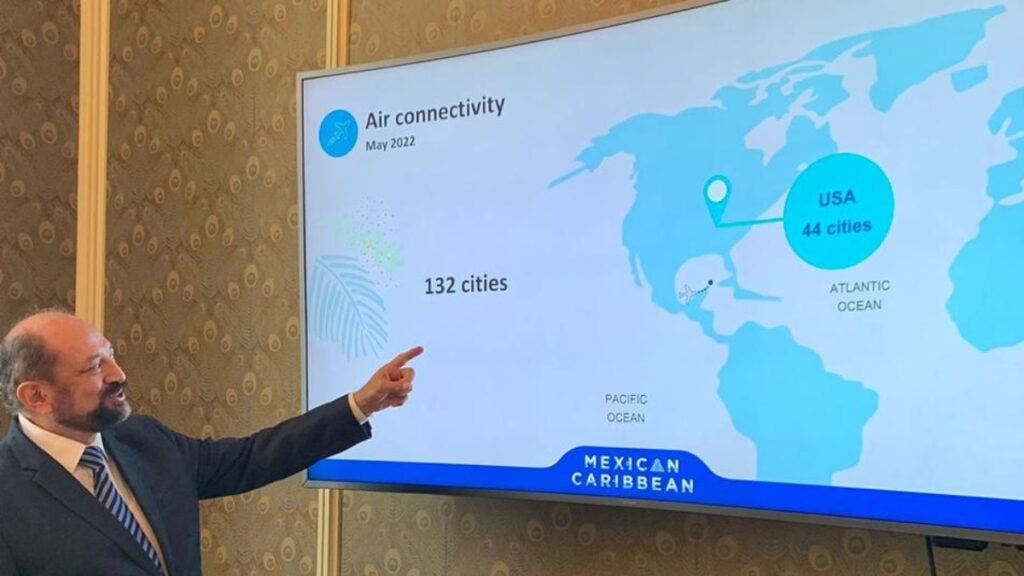“La conectividad con la que cuenta el Caribe Mexicano ha sido clave para el regreso del turismo, incluso con números que rebasan los registrados en 2019. Es así que, en 2021, Estados Unidos creció de tal manera que llegó a ser nuestro principal mercado superando al nacional, esto, en gran parte debido a la conectividad aérea que de manera directa enlaza a 44 ciudades de ese país con el Caribe Mexicano, destacando la confianza que aerolíneas como American Airlines han tenido hacia nuestros destinos, ya que a pesar de la pandemia nunca cesó sus operaciones hacia Quintana Roo, y se tiene programado un incremento en un 34% de su oferta aérea a los aeropuertos del Estado para este año”, añadió.
