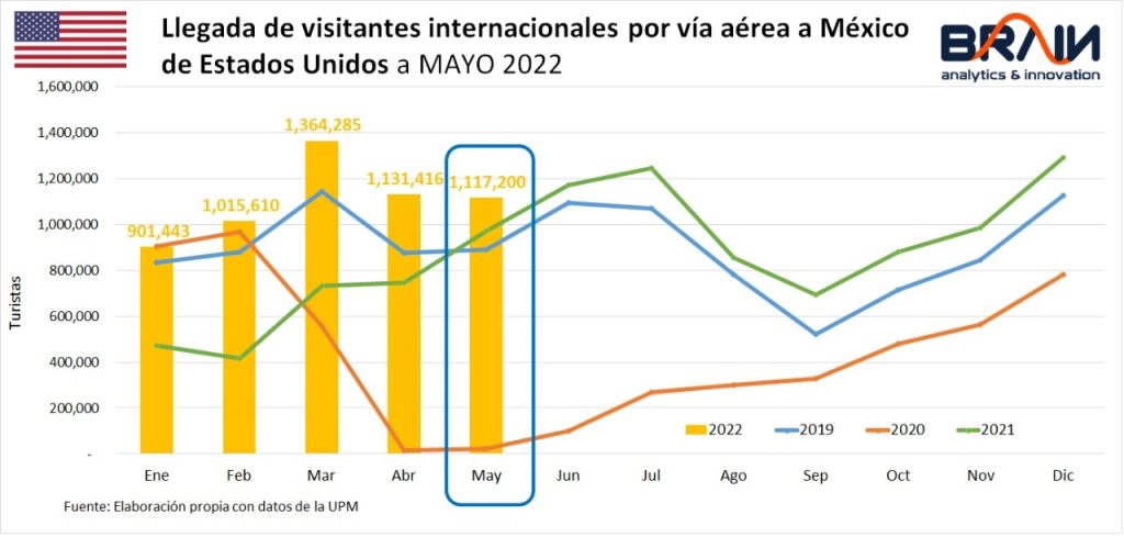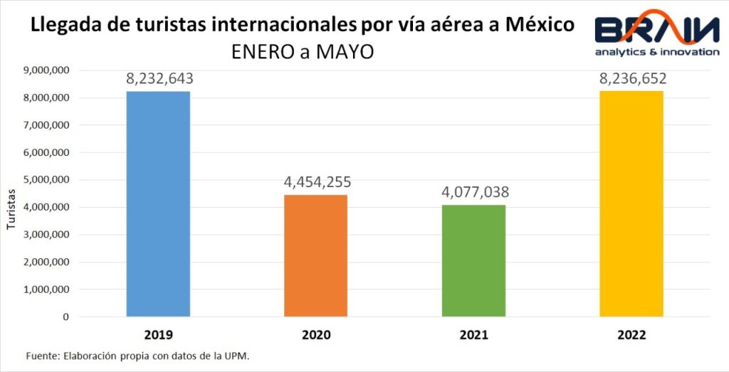 Por primera vez desde la pandemia, un acumulado (en este caso enero a mayo de 2022), la llegada de turistas internacionales vía aérea está al mismo nivel de ene-may 2019.Los turistas que provienen de USA se mantienen en niveles históricos desde febrero pasado. En mayo 2022 está +15.2% por arriba de mayo 2021