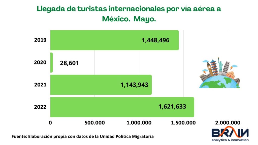 En mayo 2022, México recibe 173 mil más turistas internacionales aéreos que 2019. Por segundo mes consecutivo de este 2022, mayo superó los niveles de 2019 por 12% en las llegadas de #turistas internacionales vía aérea a México y registra un aumento de casi 42% respecto al mismo mes de 2021.