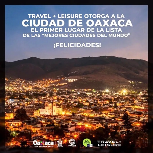 La Secretaría de Turismo del Estado de Oaxaca (Sectur Oaxaca) dio a conocer que la ciudad de Oaxaca encabeza la lista de las 25 Mejores Ciudades del Mundo de los World’s Best Awards, de la revista internacional Travel + Leisure premios que reconocen a lo mejor del sector de los viajes en el mundo.