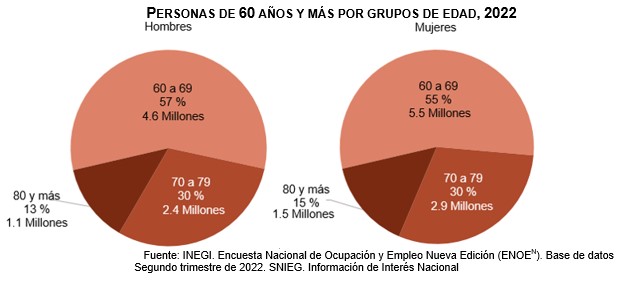 De acuerdo con la Encuesta Nacional de Ocupación y Empleo Nueva Edición (ENOEN), para el segundo trimestre de 2022 se estimó que había 17 958 707 personas de 60 años y más (adultas mayores). Esta cifra representa 14 % de la población total del país. En los hombres, este porcentaje es de 13 %; en las mujeres, de 15 por ciento. Más de la mitad (56 %) tiene entre 60 y 69 años. Conforme avanza la edad, este porcentaje disminuye: 30 % corresponde al rango de 70 a 79 años y 14 % a las personas de 80 años y más. Según sexo, el porcentaje es ligeramente más alto para los hombres de 60 a 69 y para las mujeres de 80 años y más.