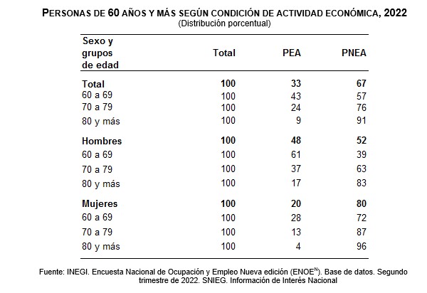 En el segundo trimestre de 2022, se estima que 33 de cada 100 personas de 60 años y más son Población Económicamente Activa (PEA) y 67 de cada 100 son Población No Económicamente Activa (PNEA). De la PEA, la tendencia muestra una disminución conforme avanza la edad; pasa de 43 % para el grupo de 60 a 69 años a 9 % entre quienes tienen 80 años y más. Según sexo, los hombres económicamente activos superan a las mujeres en todos los grupos de edad. Destaca el grupo de 80 y más: en este, casi cuatro de cada 100 mujeres forman parte de la PEA. En los hombres, el porcentaje es 17 por ciento.
