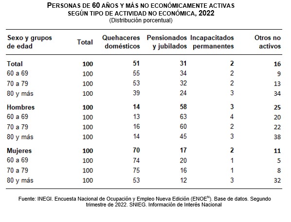 Para el segundo trimestre de 2022, la ENOEN estima que 12 110 210 personas de 60 años y más son parte de la PNEA. De estas, la mitad (51 %) se dedica a los quehaceres domésticos, 31 % está pensionada y jubilada y 2 % está incapacitada permanentemente para trabajar. Según sexo, el porcentaje de mujeres que realizan quehaceres domésticos es mayor al de los hombres (70 % frente a 14 %). Este porcentaje se invierte en las y los pensionados y jubilados: en estos casos, 58 % son hombres y 17 %, mujeres. La tendencia observada para cada sexo se repite por grupos de edad. Destaca un mayor peso relativo en los hombres jubilados de 80 años y más (45 %) y en las mujeres de la misma edad que realizan quehaceres domésticos (53 %).