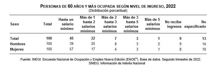 Según la Organización de las Naciones Unidas, las personas de edad avanzada suelen trabajar en empleos mal remunerados, viven del apoyo de la familia o sus ingresos se limitan a las pensiones.[2] La ENOEN indica que 45 % de las personas adultas mayores que están ocupadas gana hasta un salario mínimo, 22 % obtiene ingresos de más de un salario y hasta dos salarios mínimos y 7 % gana más de dos y hasta tres salarios mínimos. Nótese que 9 % no recibe ingresos. El porcentaje de mujeres que ganan hasta un salario mínimo es superior al de los hombres (57 % frente a 39 %). En el resto de las categorías, las mujeres se encuentran en desventaja con respecto a los hombres. Solo en el rubro de más de tres y hasta cinco salarios mínimos, el porcentaje es igual.