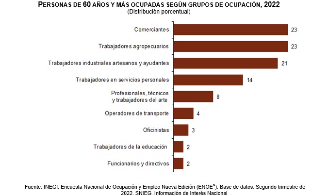 El universo de la PEA se forma por la población ocupada y desocupada. De las personas adultas mayores que conforman la PEA (5 848 497), 99 % se encuentra ocupada y 1 %, desocupada. Del grupo de personas ocupadas, 49 % trabaja por cuenta propia. Lo sigue el de las y los trabajadores subordinados y remunerados, con 38 por ciento. Son pocas las personas que llegan a una edad avanzada y son empleadoras (10 %), mientras que hay quienes no perciben remuneración por su trabajo (3 %).