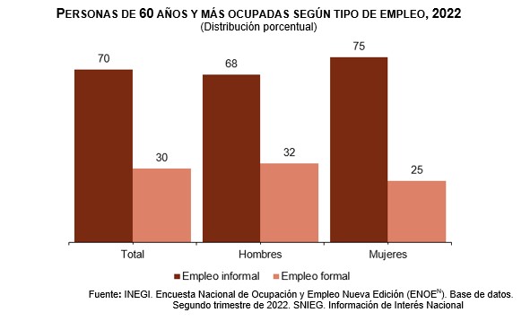 La OIT argumenta que, conforme transcurre el ciclo vital de las personas, aumenta la posibilidad de caer en el empleo informal. En México, 70 % de la población ocupada de 60 años y más tiene un empleo informal. El porcentaje de mujeres que se encuentra en esta situación es mayor que el de los hombres (75 % frente a 68 %).