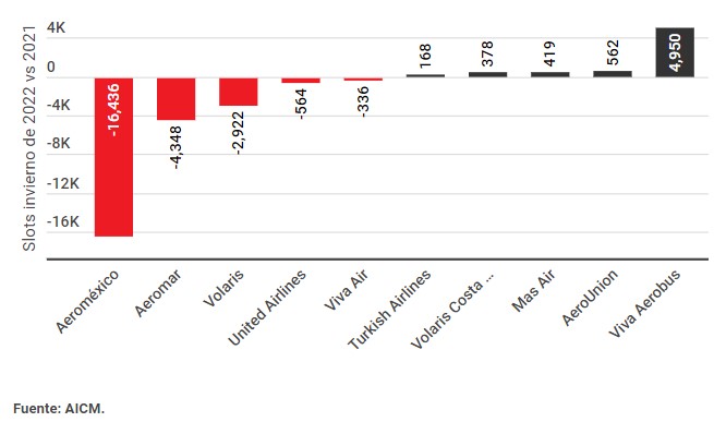 Según datos de la Subgerencia de Asignación de Slots del AICM, Aeroméxico –la aerolínea con la mayor presencia en el aeropuerto capitalino en términos de horarios– reducirá sus horarios en 17% para la temporada de invierno de este año en comparación con 2021, con lo cual dejará de operar en 16,436 franjas horarias. Esta reducción equivale a 88% del total de slots recortado.
