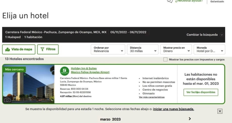 No obstante, en una revisión hecha por Forbes México al calendario de reservaciones del Holiday Inn & Suites Mexico Felipe Angeles Airport, la cadena hotelera ofrece disponibilidad de habitaciones hasta el 1 de marzo del siguiente año.