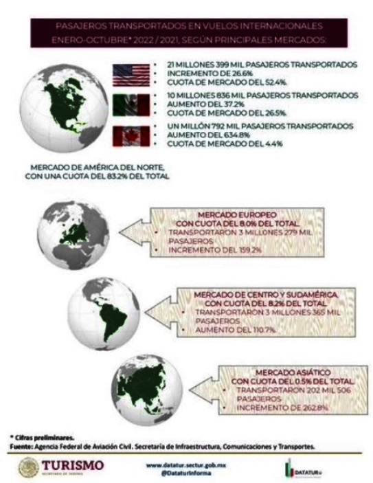 En cuanto a los pasajeros transportados en vuelos internacionales en los primeros 10 meses del año, según los principales mercados, América del Norte concentra una cuota del 83.2% del total, de los cuales del mercado estadounidense se transportaron 21 millones 399 mil pasajeros,  con un incremento de 26.6%, respecto a 2021; 10 millones 836 mil pasajeros corresponden a vuelos internacionales en aerolíneas mexicanas, esto es 37.2% más que el año pasado; y un millón 792 mil pasajeros en vuelos de Canadá, lo que representa un aumento del 634.8%, comparado con el mismo periodo de 2021.