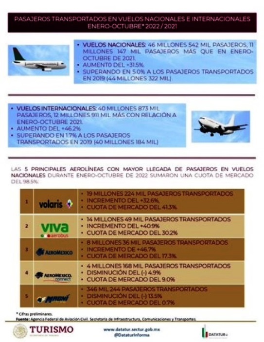 De enero a octubre de 2022, las principales aerolíneas mexicanas que transportaron pasajeros en vuelos internacionales fueron Aeroméxico y Volaris, que reportaron 8 millones 435 mil pasajeros, lo que significa un incremento de 43.4% comparado con los primeros 10 meses de 2021; superando también con un 2.3% los pasajeros de enero-octubre de 2019, cuando transportaron 8 millones 246 mil pasajeros.