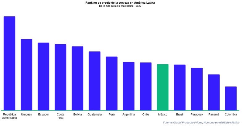 El ranking mostró que a pesar de los efectos de la inflación en el aumento de precios, México está entre los 5 países con precios más asequibles para comprar una cerveza en la región. En el ranking de América Latina, México tiene la 5ª cerveza más barata, solo superada por Brasil, Paraguay, Panamá y Colombia.
