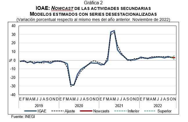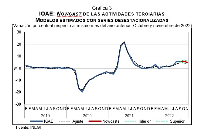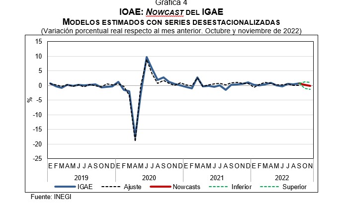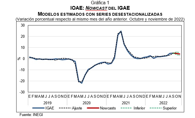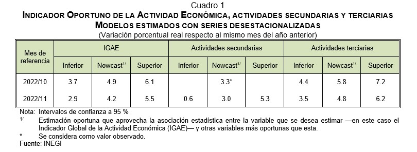 Para noviembre de 2022, el IOAE estima una variación de 4.2 % a tasa anual del IGAE. Las estimaciones realizadas presentan sus respectivos intervalos de confianza a 95 % para los meses de octubre y noviembre de 2022. En el mes de referencia y para los grandes sectores de actividad del IGAE, se calcula un incremento anual de 3 % en las actividades secundarias y de 4.8 % en las terciarias. Las estimaciones se refieren a cifras desestacionalizadas.