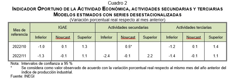Para noviembre de 2022, el IOAE estima que el IGAE disminuyó 0.1 % respecto a octubre del mismo año. Al considerar los principales grandes sectores de actividad del IGAE, se calcula una reducción mensual de 0.1 % para las actividades secundarias y terciarias.