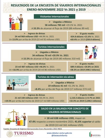 Comentó que el ingreso de divisas por turistas de internación vía aérea de enero a noviembre de 2022 tuvo un aumento de 50.2% contra 2021, al registrar 21 mil 140 millones de dólares, y un incremento de 19.5% respecto a los 17 mil 689 millones de dólares captados en el mismo periodo de 2019.