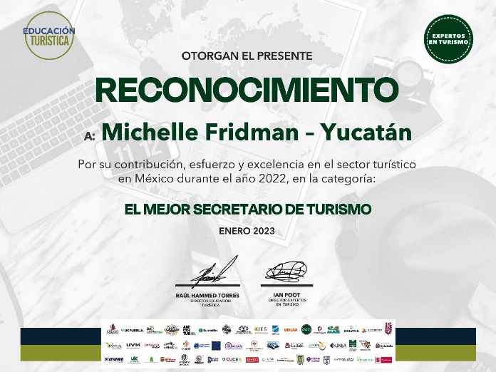 Dicha Institución, año con año convoca y reúne a líderes de la industria turística de México, así como a todos aquellos especialistas responsables de formar a los próximos líderes del turismo nacional, y seleccionan de entre diversos actores de la industria pública, privada y de gobierno a quienes con sus acciones contribuyen a mejorar diversos aspectos del sector en el país, siendo en la última edición de esta votación, donde se reconoció a Michelle Fridman Hirsch, Titular de la Secretaría de Fomento Turístico de Yucatán (Sefotur), como “Mejor Secretaria de Turismo”.