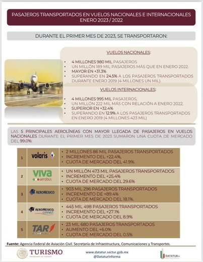 La Secretaría de Turismo dio a conocer que en enero de 2023 se registraron 4 millones 980 mil pasajeros transportados en vuelos nacionales, esto es 31.3% más que en el mismo periodo de 2022 y superando también con 24.5% los 4 millones un mil pasajeros transportados en el mismo mes de 2019.