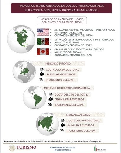 En cuanto a los pasajeros transportados en vuelos internacionales en enero de 2023, según los principales mercados, América del Norte concentra una cuota del 84.8% del total, de los cuales, del mercado estadounidense se transportaron 2 millones 420 mil pasajeros, un incremento de 24.4%, respecto a enero 2022; en tanto, un millón 283 mil pasajeros corresponden a vuelos internacionales en aerolíneas mexicanas, esto es 31% más que durante enero de 2022; y 534 mil 153  pasajeros en vuelos de Canadá, lo que representa un aumento del 180.4%, comparado con lo transportado en enero de 2022.