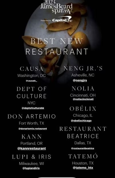 Este año, uno de los nominados dentro de la categoría Best New Restaurant (Mejor Restaurante Nuevo), es Don Artemio, el restaurante dirigido por el chef Juan Ramón Cárdenas, autor del libro La Senda del Cabrito (Ed. Larousse, 2020) y organizador del foro Guerreros del Maíz. Son 10 restaurantes los nominados a dicha categoría, sabremos quién será el ganador de este año hasta el 5 de junio en donde los premiados serán reconocidos en una gala en el Lyric Opera de Chicago.