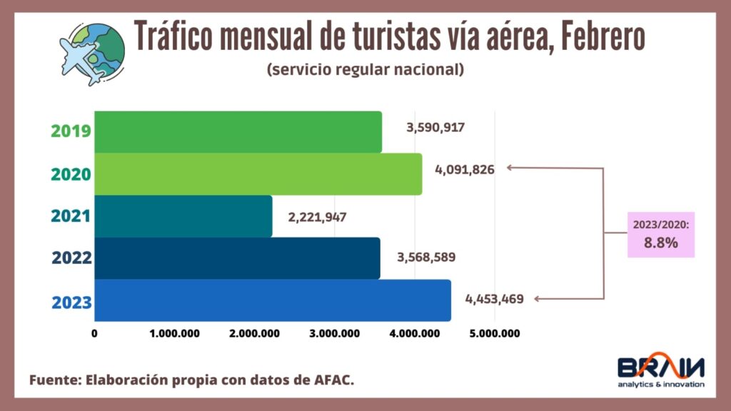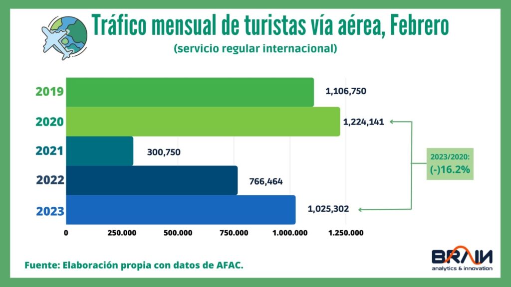 En febrero de 2023, el turismo nacional vía aérea ha superado los datos prepandemia. Sin embargo, el tráfico internacional se ha reducido en un (- )16,2% con respecto al 2020. Share Construlita Proyectos -