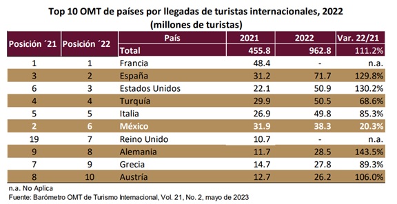 La Sectur señaló que, durante 2022, llegaron a nuestro país 38 millones 327 mil turistas internacionales, lo que representó un crecimiento del 20.3% con respecto al observado en 2021 y solo a 14.9% de lo registrado en 2019. De esta forma, México se sitúa en la sexta posición del ranking de la OMT, por debajo de Francia, España, Estados Unidos, Turquía e Italia; lo que representa un avance, considerando que al cierre de 2018, nuestro país se ubicó en el lugar 7 en llegada de turistas internacionales.
