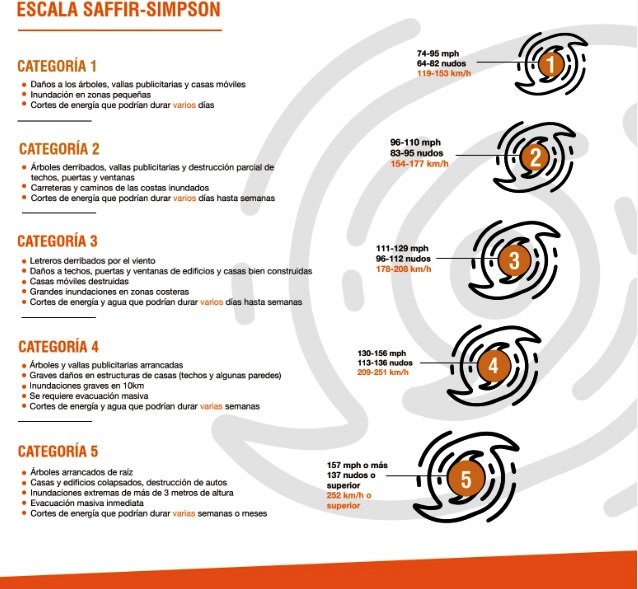 En tanto, en los huracanes de categoría 2 cuyos vientos van desde los 154 hasta los 177 km/h, construcciones más sólidas pueden verse afectadas, aumenta la posibilidad de que árboles se caigan y que caminos y vías de comunicación se encuentren bloqueadas.