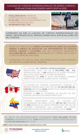 Los principales países emisores fueron Estados Unidos, Canadá y Colombia, con 6 millones 885 mil turistas; esto es 6.2% más respecto a los primeros cinco meses del 2022, y superando también en 12.8% los 6 millones 102 mil turistas del mismo periodo en 2019.
