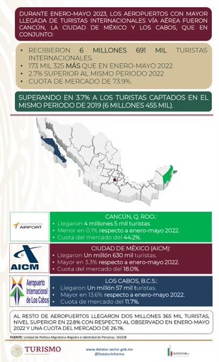 Por otra parte, entre enero y mayo de 2023, Cancún, el AICM y Los Cabos, fueron los aeropuertos que recibieron el mayor número de turistas internacionales, con 6 millones 691 mil turistas, esto es 173 mil 325 más que los primeros cinco meses de 2022; superando también en 3.7%, las llegadas en el mismo periodo de 2019, cuando arribaron 6 millones 455 mil turistas.