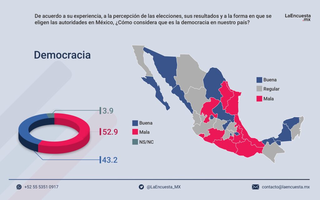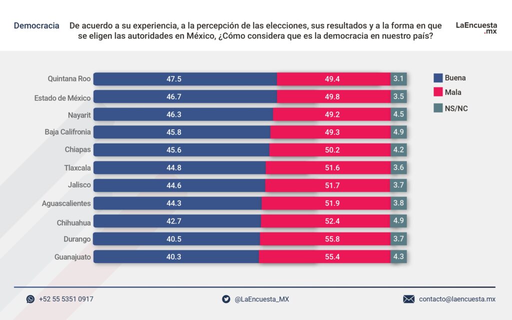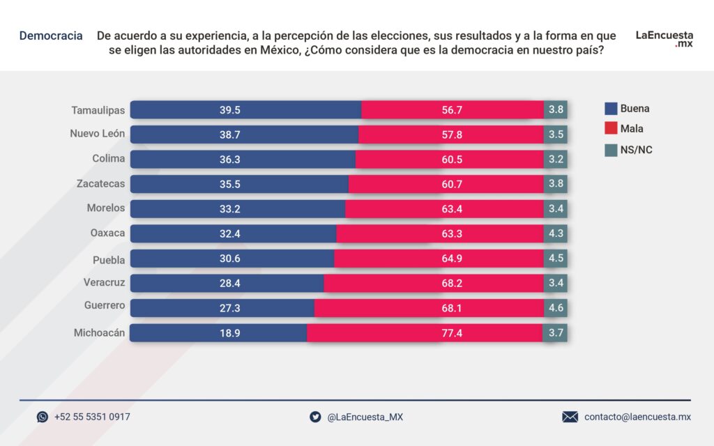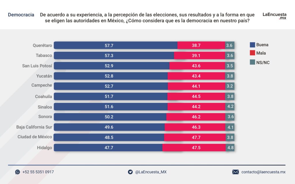 Querétaro obtiene el primer puesto con el 57.7% en cuanto a la democracia del país y Michoacán es el peor evaluado con el 18.9%