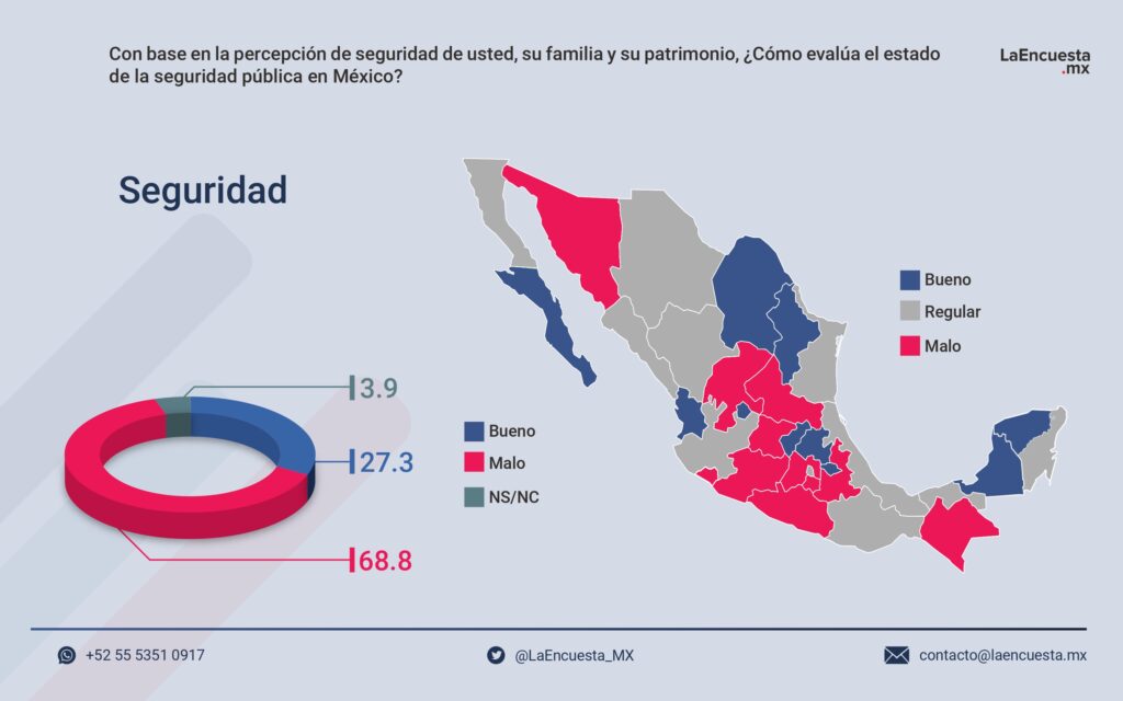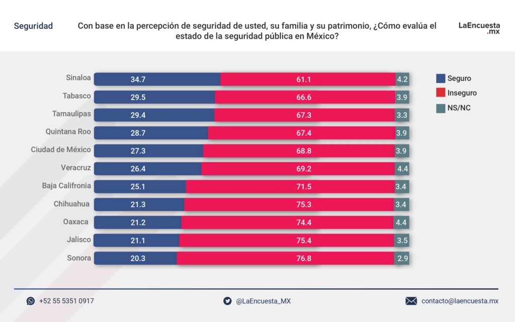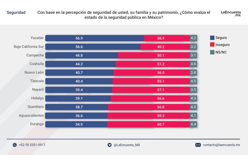 Finalmente., el estado de Yucatán ocupa la primera posición en cuanto a la seguridad pública del país con el 56.9% y Michoacán es el peor evaluado con únicamente el 7.6%