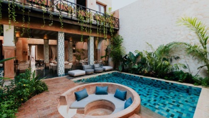 En sus 10 habitaciones y suites el huésped disfruta de una arquitectura interior que provee una sensación de luminosidad, amplitud y frescura. Rasgos como muros de un blanco impoluto, una paleta cromática de tonos terracota, sus techos con vigas de madera y los pisos de pasta en matices azules con el motivo “canage” evocan la estética vernácula de las haciendas enclavadas en la selva y el colorido de los cenotes.