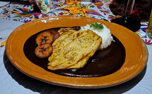 “Después, una sopa de setas y el platillo fuerte, un rico mole de metate con pechuga de pollo, arroz y plátano frito, adornado con flor de cempasúchil, y por último, un pan de muerto con chocolate de molinillo”, menciona.