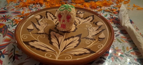 Karla Museos describe que los platos que se sirven son una forma de adaptar el Día de Muertos. “Vamos a empezar con un tamal de frijol que contiene maíz, un elemento súper importante en las ofrendas mexicanas.