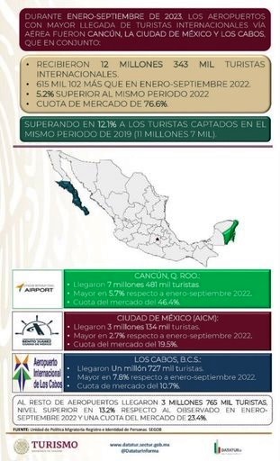 Informó también que, entre enero-septiembre de 2023, Cancún, el Aeropuerto Internacional de la Ciudad de México (AICM) y Los Cabos, fueron los aeropuertos que recibieron el mayor número de turistas internacionales, con 12 millones 343 mil turistas, esto es 5.2% más respecto a los primeros nueve meses de 2022; superando también con 12.1% las llegadas en el mismo periodo de 2019, cuando arribaron 11 millones 7 mil turistas.