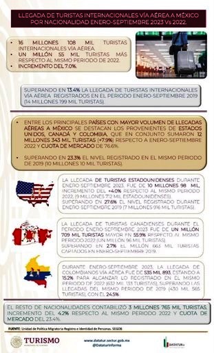 La Secretaría de Turismo dio a conocer que, en el periodo de enero a septiembre de 2023, se registró la llegada de 16 millones 108 mil turistas internacionales vía aérea a nuestro país según su nacionalidad, lo que representa un incremento de 7% comparado con lo registrado en el mismo periodo de 2022.