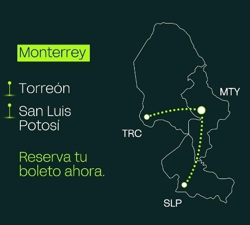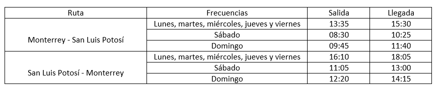 La ruta Monterrey- San Luis Potosí- Monterrey iniciará el lunes 18 de diciembre con frecuencia diaria, con el siguiente detalle de operación: