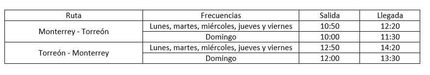 La ruta Monterrey- Torreón- Monterrey iniciará el lunes 27 de noviembre con 6 vuelos semanales y sus horarios son los siguientes: