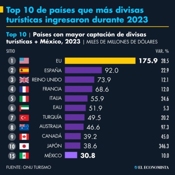 Por su parte, España captó 92 millones de dólares por turismo y el Reino Unido ingresó 73.4 millones de dólares.