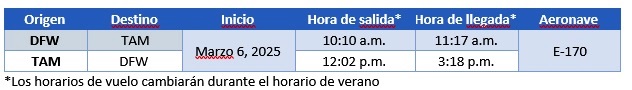 American Airlines continúa ampliando su presencia en México a través de un nuevo servicio que operará todo el año desde el Aeropuerto Internacional de Dallas Fort Worth (DFW) al Aeropuerto Internacional de Tampico (TAM) a partir de marzo del 2025.