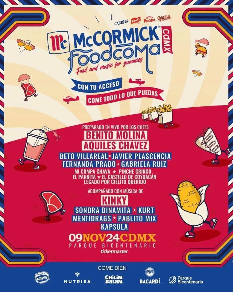 El festival gastronómico y musical Foodcoma tendrá lugar el próximo 9 de noviembre en el Parque Bicentenario. El costo del boleto general será de $793 pesos y el Boleto VIF (Very Important Foodies) costará $1,342.
