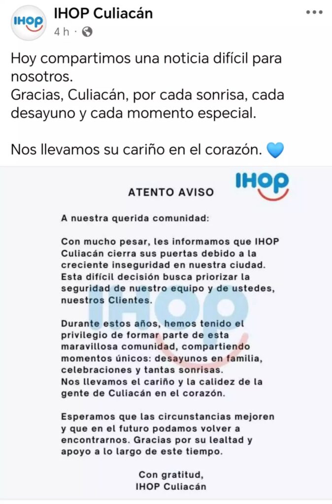 El restaurante de origen estadounidense informó a través de sus redes sociales sobre el cierre de esta unidad, con el fin de priorizar la seguridad de sus colaboradores. “IHOP Culiacán cierra sus puertas debido a la creciente inseguridad en nuestra ciudad”, dice el comunicado.