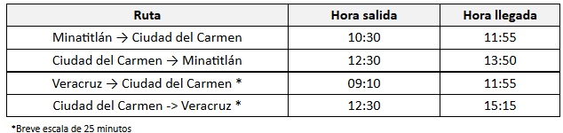 Los vuelos entre Ciudad del Carmen y Veracruz, así como, Ciudad del Carmen y Minatitlán iniciarán operaciones el próximo 1 de septiembre en los siguientes horarios, de lunes a viernes y también domingo: