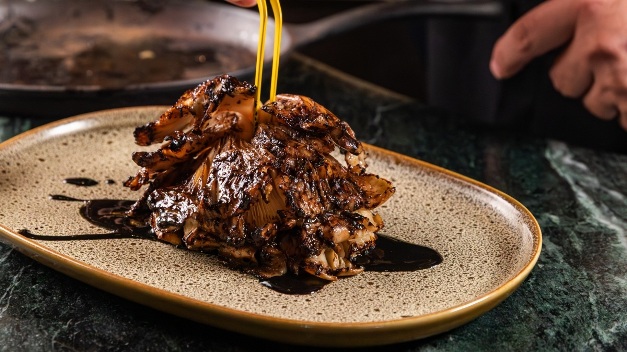 Setas marinadas en ajo negro, bañadas en un “chichilo” negro.