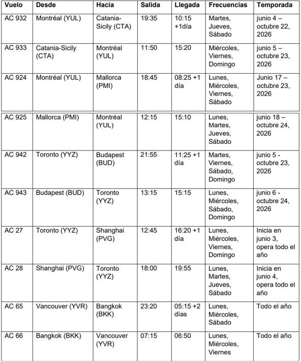 A partir del próximo año, la aerolínea lanzará nuevas rutas desde Montréal hacia Catania, en Sicilia, Italia y, hacia Palma de Mallorca, España. Desde Toronto, la aerolínea restablecerá sus vuelos directos a Budapest y Shanghái, además de incrementar sus operaciones a Praga. La popular ruta estacional Vancouver-Bangkok ahora operará durante todo el año, consolidando la posición de Air Canada como la única aerolínea de Norteamérica que ofrece un servicio directo y sin escalas hacia la capital tailandesa.