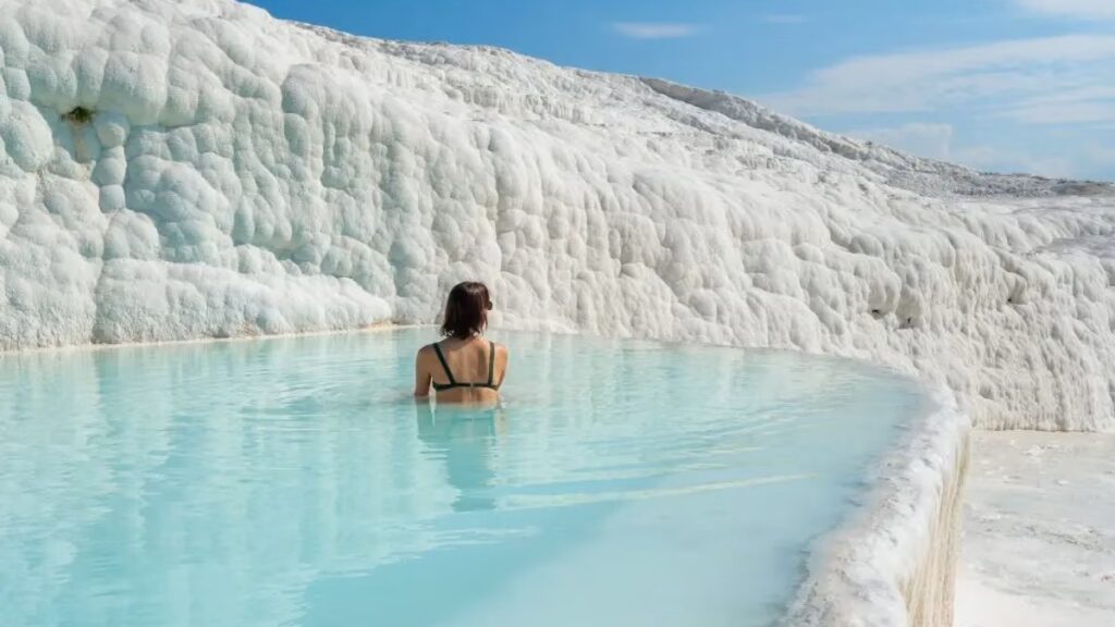 A lo largo de las terrazas se forman albercas naturales donde los visitantes pueden caminar descalzos y sumergirse en aguas termales mientras disfrutan de vistas surrealistas. Los efectos visuales, especialmente al amanecer o al atardecer, ofrecen un espectáculo donde la ciencia y la poesía se encuentran.